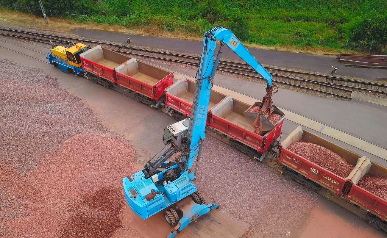 Die Verladung von Gleisschotter auf Güterzüge erfolgt über einen nahegelegenen Gleisanschluss mit Verladeterminal.